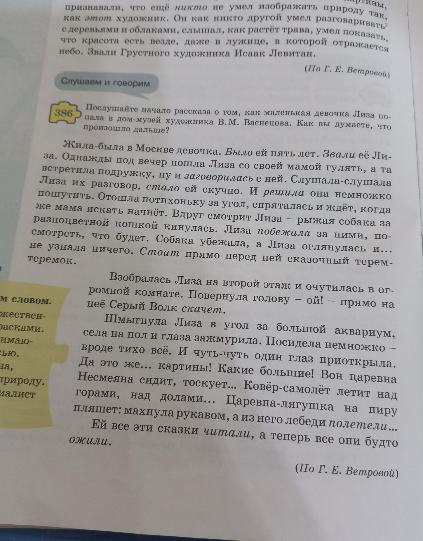 ори 386 Послушайте начало рассказа о том, как маленькая девочка Лиза по- пала в дом-музей художника В.М. Васнецова. Как вы думаете, что произошло дальше? помагитееее умоляю