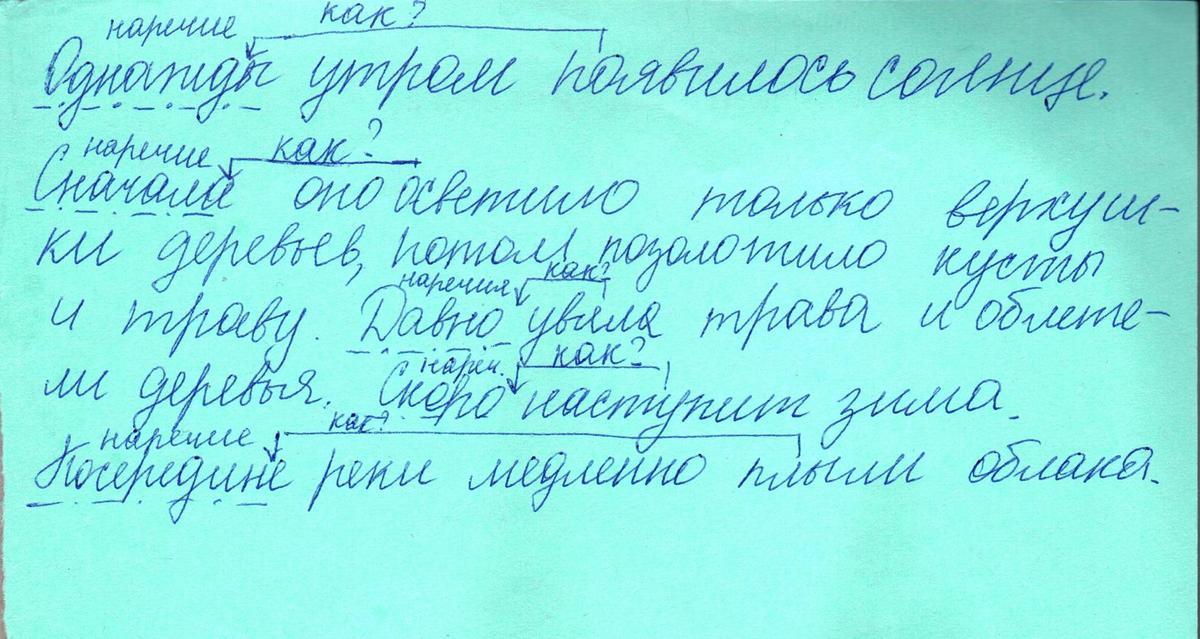 найти наречие задать к словам вопросы и подчекнуть как член предложения Однажды утром появилось солнце. Сначала оно осветило только верхушки деревьев, потом позолотило кусты и траву давно увяла трава и облетели деревья. Скоро наступит зима посередине реки медленно плыли облока