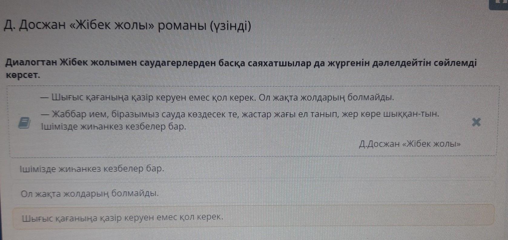 Диалогтан Жібек жолымен саудагерлерден басқа саяхатшылар да жүргенін дәлелдейтін сөйлемді көрсет. Шығыс қағаныңа қазір керуен емес қол керек. Ол жақта жолдарың болмайды. Жаббар ием, біразымыз сауда көздесек те, жастар жағы ел танып, жер көре шыққан-тын. Ішімізде жиһанкез кезбелер бар. Д.Досжан «Жібек жолы» Х Ішімізде жиһанкез кезбелер бар. Ол жақта жолдарың болмайды. Шығыс қағаныңа қазір керуен емес қол керек.