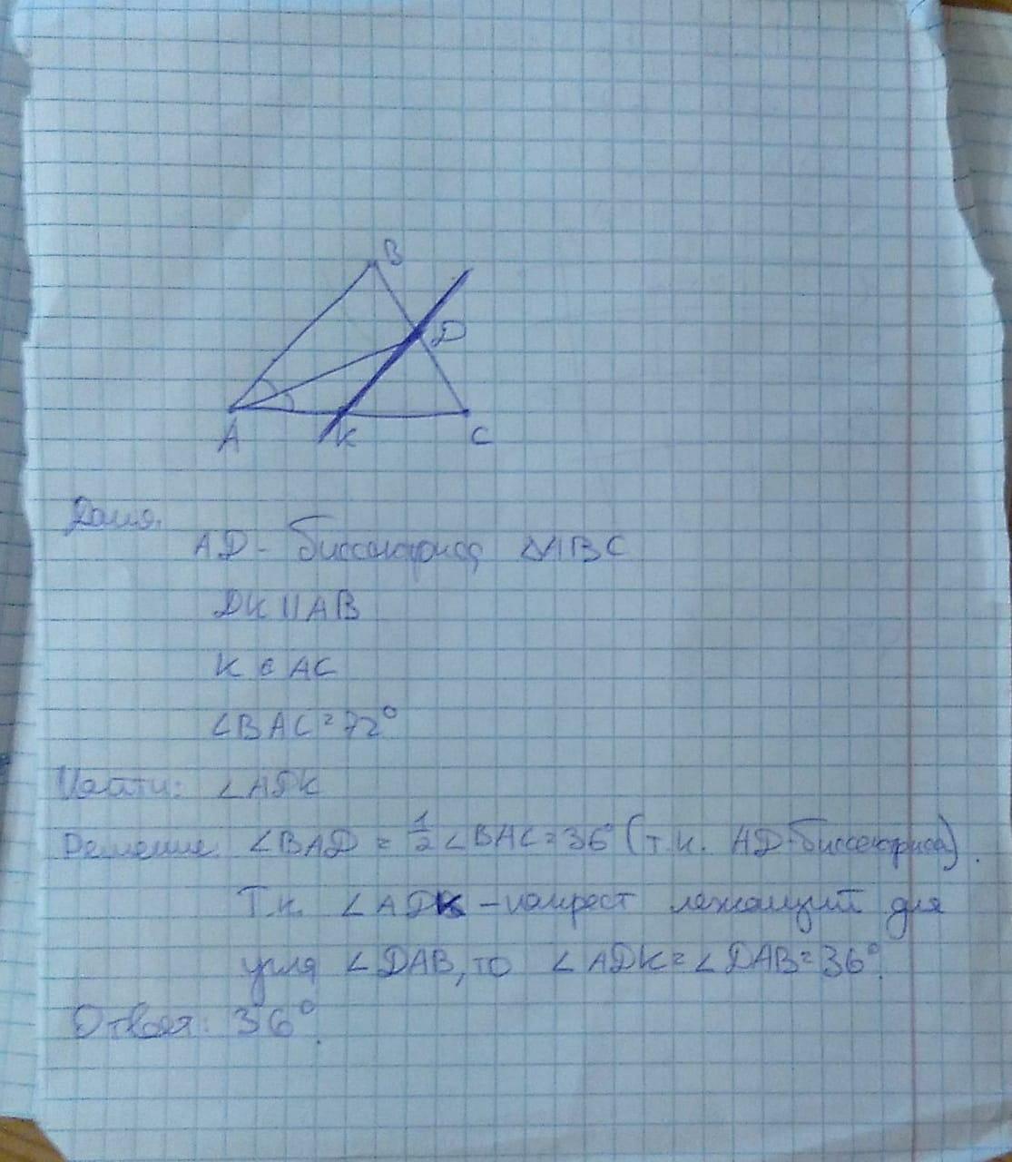 .3.Отрезок АD-биссектриса треугольника АВС. Через точку D проведена прямая, параллельная стороне АВ и пересекающая сторону АС в точке К. Найти угол АDК, если угол ВАС=72 градуса.
