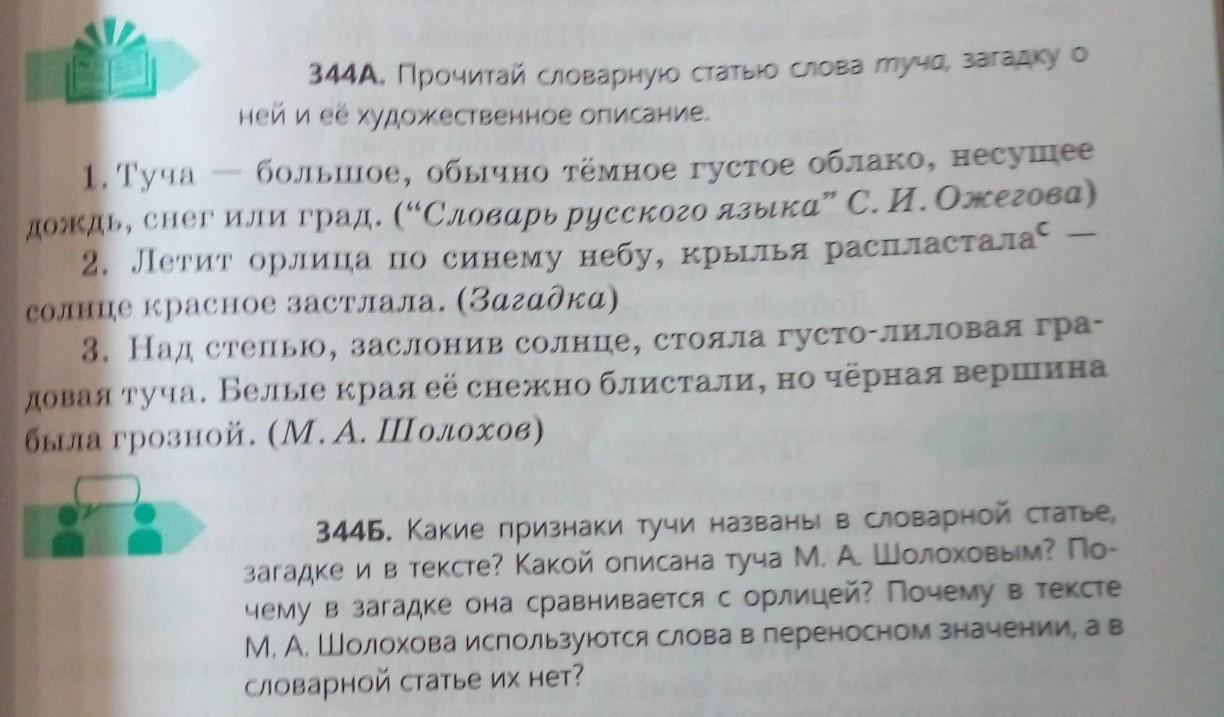 344Б. Какие признаки тучи названы в словарной статье, загадке и в тексте? Какой описана туча М. А. Шолоховым? По- чему в загадке она сравнивается с орлицей? Почему в тексте М. А. Шолохова используются слова в переносном значении, а в словарной статье их нет?