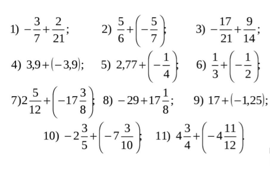 3.) -17/21 + 9/14 = -34/42 + 27 /42 = -7/42