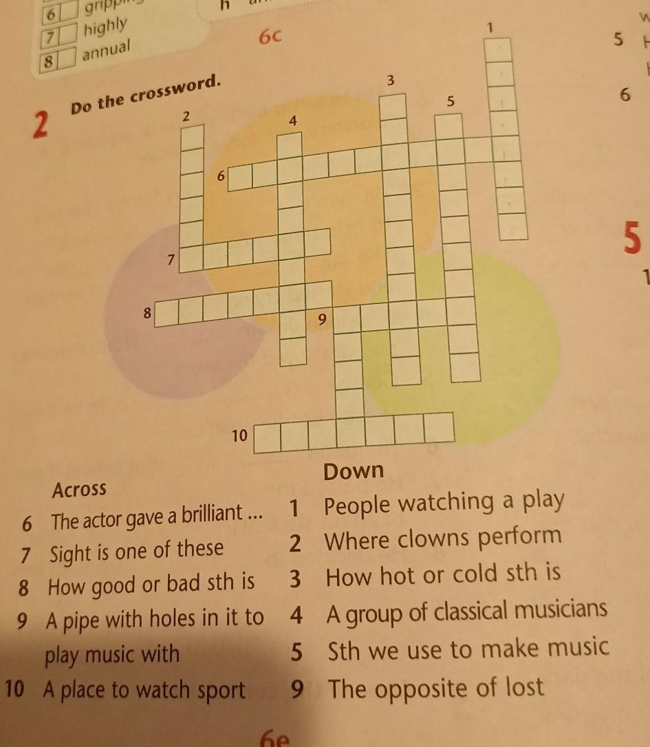5 Do the crossword. 2 5 2 6 7 8 9 10 7 Across 6 The actor gave a brilliant ... 1 7 Sight is one of these 8 How good or bad sth is 9 A pipe with holes in it to play music with 10 A place to watch sport Down 1 People watching a play 2 Where clowns perform 3 How hot or cold sth is 4 A 4 A group of classical musicians 5 Sth we use to make music 9 The opposite of lost 60