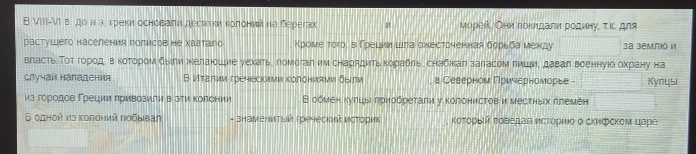 7-Купцы покупали в колониях для перепродажи в городах Греции: Пшеницу Рабов Шкуры животных, мёд.