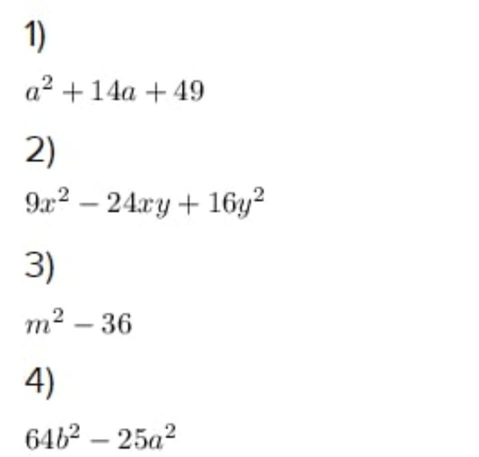 1. Подайте у вигляді многочлена вираз: 1) (a + 7)"; 3) (m – 6) (m+6); 2) (3х – 4у2; 4) (5а + 86) (8- 5а).