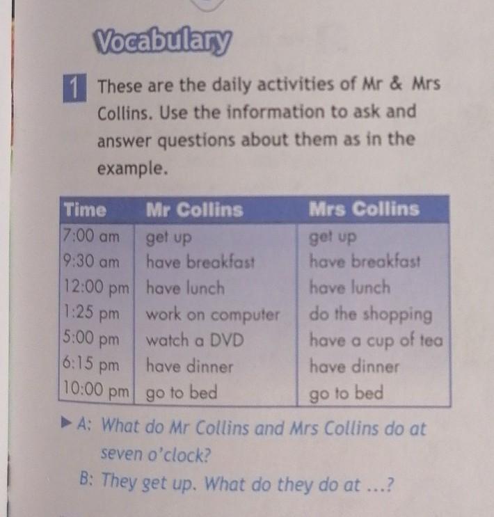 These are the daily activities of Mr & Mrs Collins. Use the information to ask and answer questions about them as in the example. 7:00 am 1:25 pm Time Mr Collins Mrs Collins get up 9:30 am I have breakfast have breakfast 12:00 pm have lunch have lunch work on computer do the shopping 5:00 pm watch a DVD have a cup of tea 6:15 pm have dinner have dinner 10.00 pm go to bed A: What do Mr Collins and Mrs Collins do at seven o'clock B: They get up. What do they do at ...? go to bed