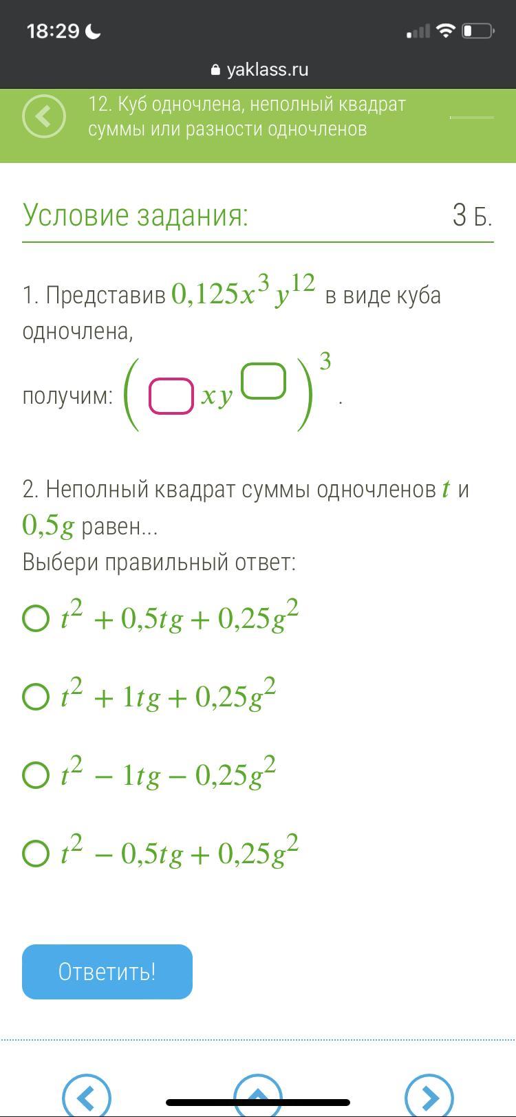 2) Неполный квадрат суммы одночленов t и 0,5g равен сумме квадратов этих одночленов плюс их произведение: