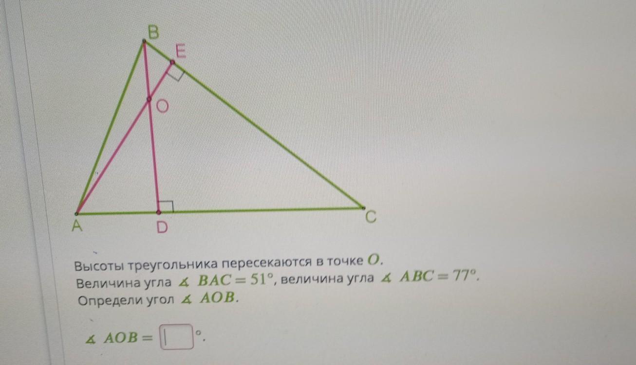 так как мы знаем два угла треугольника АВС, может найти третий, он равен 52. У нас есть четырехугольник ОDCE, в котором 2 угла по 90°, а в сумме они 360°, значит, угол DOE равен 128. И этот угол дополняет углы BOE и AOD до 180°, значит, эти 2 угла равны 52°. Тогда в сумме эти углы и составляют угол AOB = 52+52+128= 232°