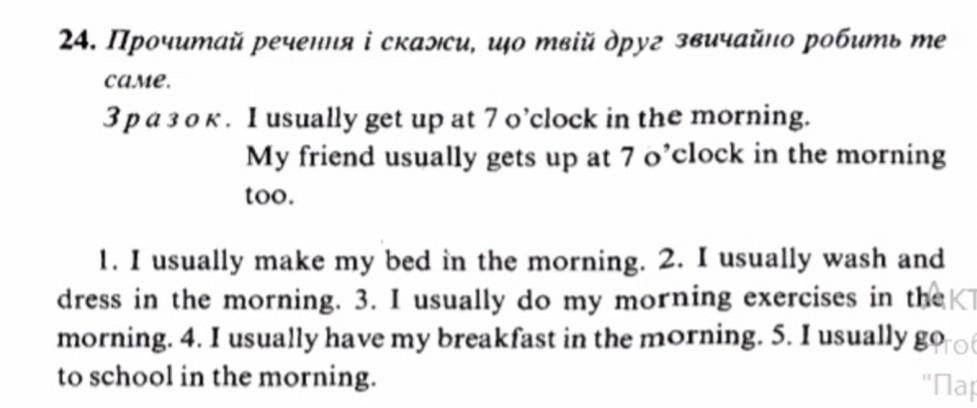 My friend usually make his bed in the morning.Friend usually wash his hand and dress in the morning. He always do his morning exercises in the morning.Friend always have him breakfast in the morning. In the morning hi always go to school.