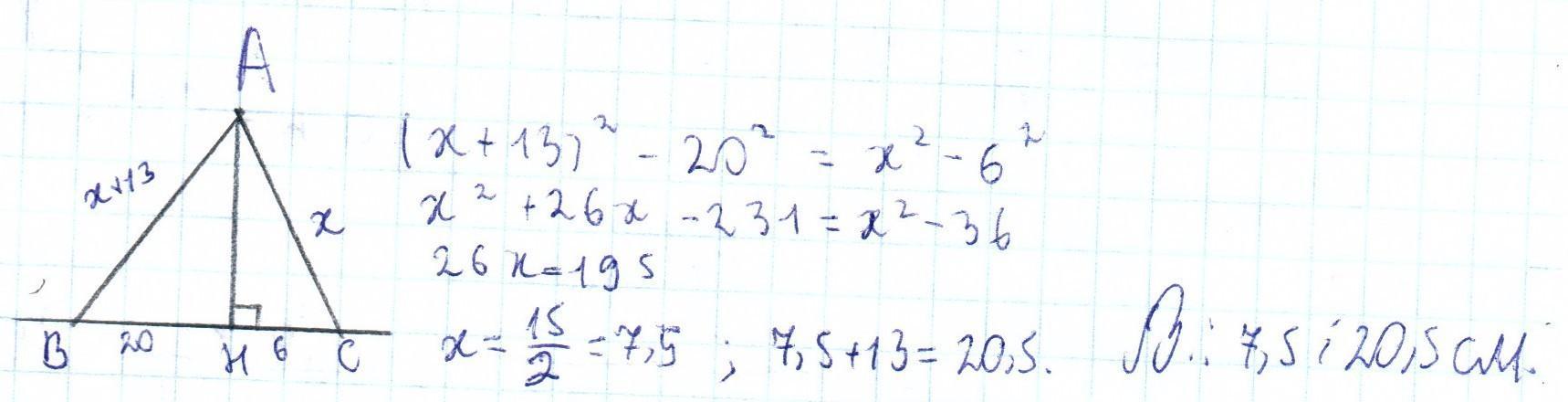 Із точки до площини проведено дві похилі. Знайти суму ДОВЖИН похилих, якщо одна з них на 13 см більша від Другої, а проекцiï похилих дорiвнюють 6 см і 20 см.