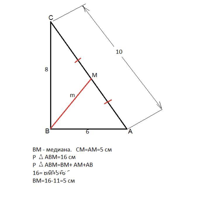 В треугольнике ABC стороны AB=6 см,BC=8 см и медиана BM=5см.Найти площадь треугольника BMC.помгите пожалуйста