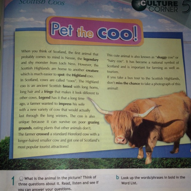В Шотландии коров называют "волосатая корова". Высокогорная корова это древняя шотландская порода с длинными рогами, длинной шерстью и бахромой, что отличает ее от других коров. По легенде, много лет назад, фермер хотел впечатлить свою жену новой разновидностью коровы, которая проживет в течении долгой зимы. Корова также уникальна тем, что может выжить на бедных пастбищах, есть растения, которых другие животные не могут.
