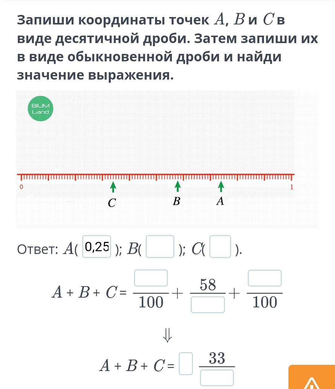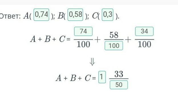 А+B+C=34/100+58/100+74/100=>A+B+C=1 33/50