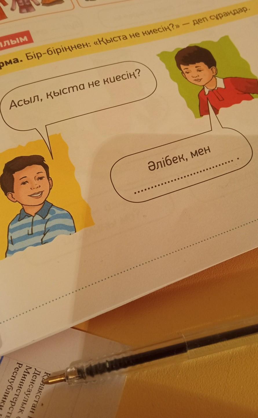 Айтылым - 4-тапсырма. Бір-біріңнен: «Қыста не киесің?» – деп сұраңдар. Асыл, қыста не киесің? Әлібек, мен