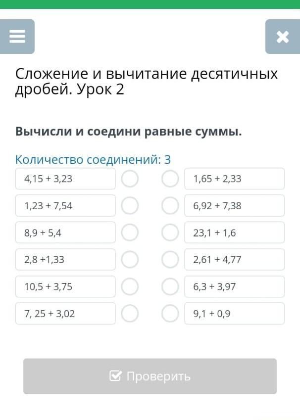 Сложение и вычитание десятичных дробей. Урок 2 Вычисли и соедини равные суммы. Количество соединений: 3 4, 15 + 3, 23 1, 65 + 2, 33 1, 23 + 7, 54 6, 92 + 7, 3epsilon 8, 9 + 5, 4 23, 1 + 1, 6 2, 8 + 1, 33 2, 61 + 4, 77 10, 5 + 3, 75 6, 3 + 3, 97 7,25 +3,02 9, 1 + 0, 9