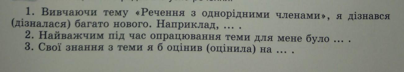 1.Наприклад,що однорідні члени речення-це рівноправні члени речення,що відносяться до одного слова,відповідають на одне й те саме питання,відіграють однакову синтаксичну роль.