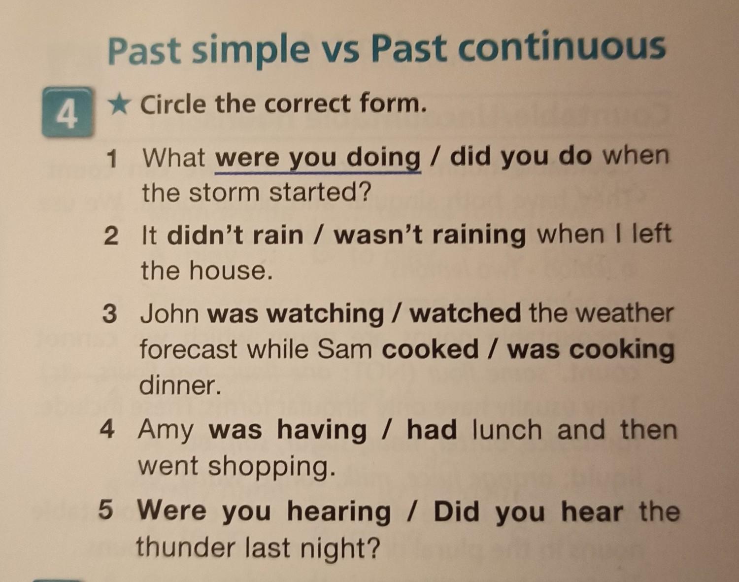 Past simple vs Past continuous 4 * Circle the correct form. 1 What were you doing / did you do when the storm started? 2 It didn't rain / wasn't raining when I left the house. 3 John was watching / watched the weather forecast while Sam cooked / was cooking dinner. 4 Amy was having / had lunch and then went shopping. 5 Were you hearing / Did you hear the thunder last night?