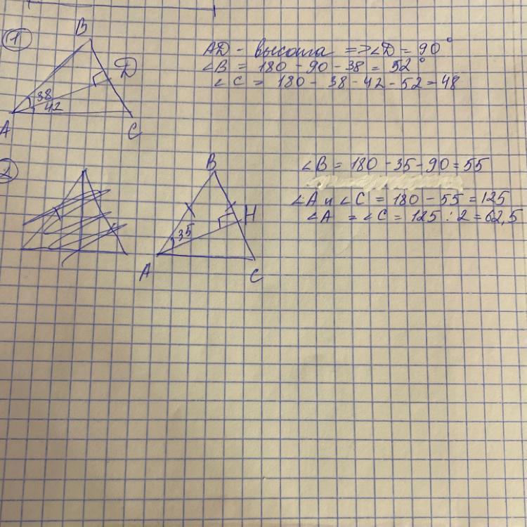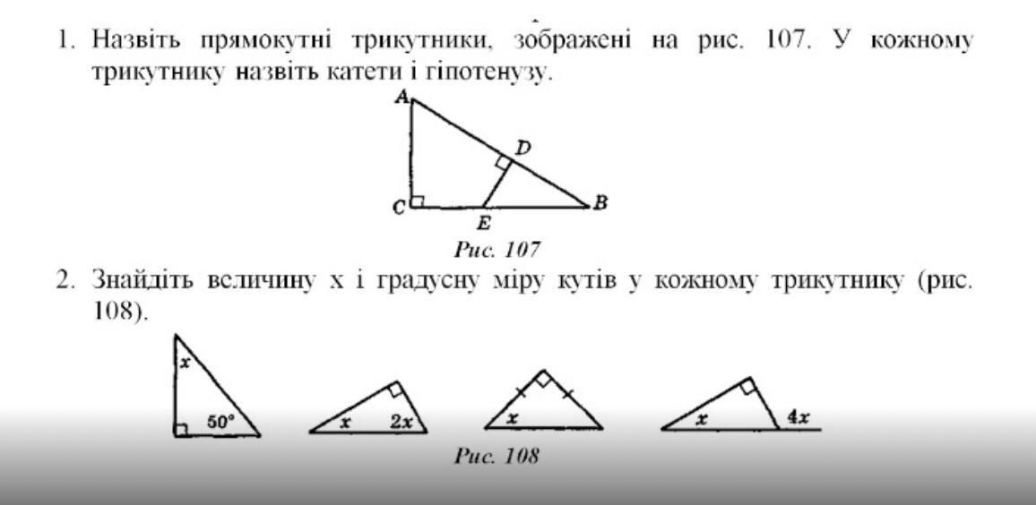 Второе фото: 1. Прямоугольные треугольники: АВС(катеты: АС и СВ, гипотенуза АВ) и ВДЕ(катеты: ДВ и ДЕ, гипотенуза ДЕ)