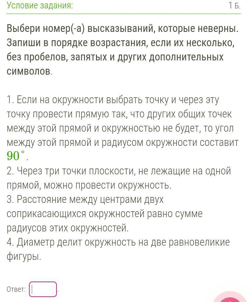 1 - касательная окружности имеет 1 общую точку с окружностью и всегда перпендикулярна радиусу