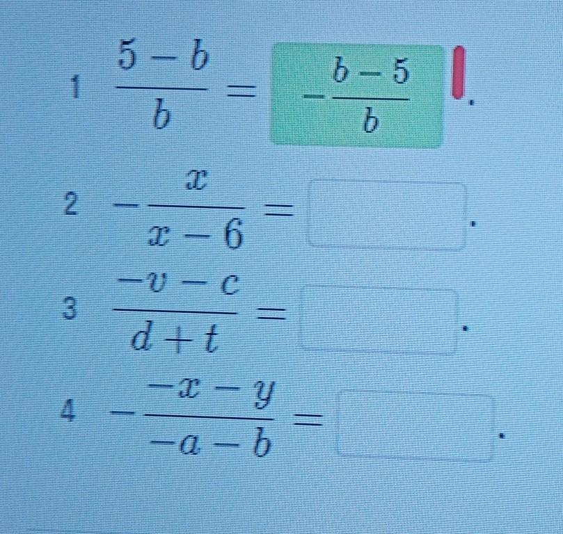 Преобразуй дробь так, что бы знак, стоящий перед дробью, изменился на противоположный.