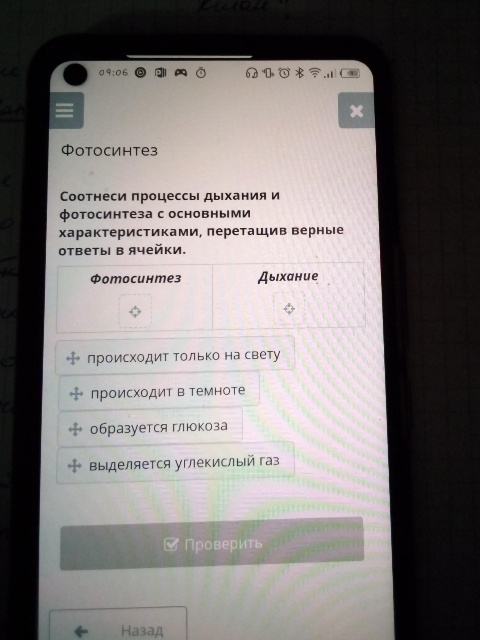 Соотнеси процессы дыхания и фотосинтеза с основными характеристиками, перетащив верные Ответы в ячейки.