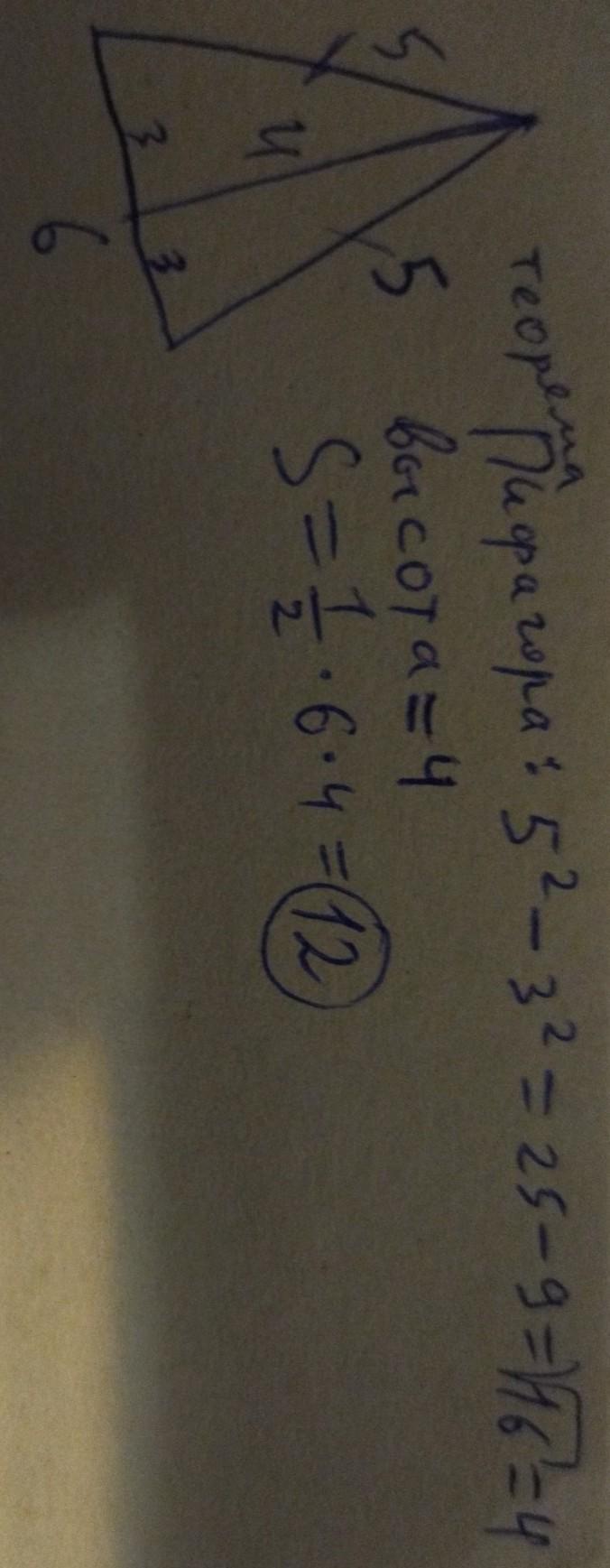 боковая сторона равнобедренного треугольника равна 5,а основание равно 6,найдите площадь треугольника