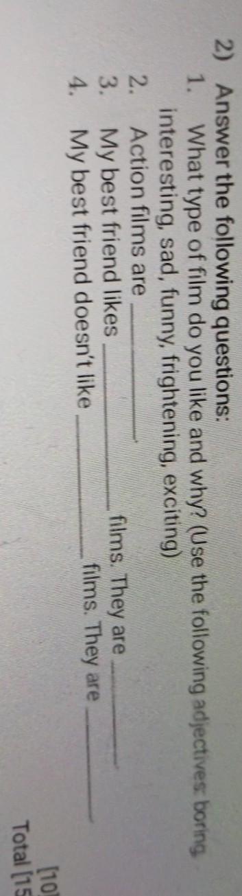2) Answer the following questions, 1. What type of film do you like and why? (Use the following adjectives boring interesting, sad, funny, frightening, exciting) 2. Action films are 3. My best friend likes films. They are 4. My best friend doesn't like films. They are