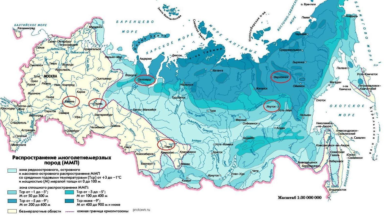 Как видно из карты, которая дана ниже в приложении, вечная мерзлота наблюдается в Салехарде, Якутске и Верхоянске, поэтому в этих городах необходимо пользоваться специальными сваями для возведения зданий.