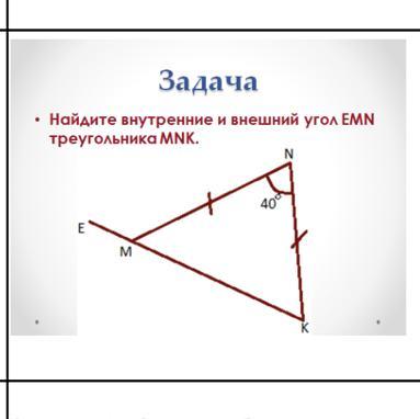 дано:1.угол М=К по признаку равнобедренного треугольника. 2. угол N=40° 3. mn=nk. найти угол ЕМN и угол м и к.