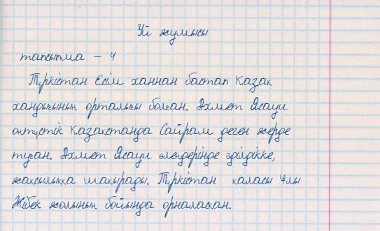 4-тапсырма. Сөйлемдерді дұрыс құрастырып, жаз. Есім ханнан бастап Түркістан Қазақ хандығының орталығы болған. 1. Ахмет деген Сайрам Оңтүстік жерде Қазақстанда Ясауи туған. Ясауи әділдікке жақсылыққа, Ахмет шақырады өлеңдерінде. АТүркістан Жібек (Ясы) қаласы Ұлы бойында жолының орналасқан. помогите пожалуйста СРОЧНО