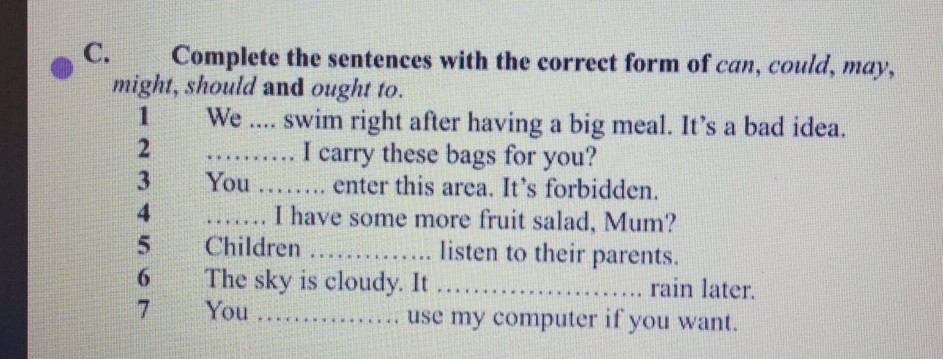Complete the sentences with the correct form of can, could, may, might, should and ought to.