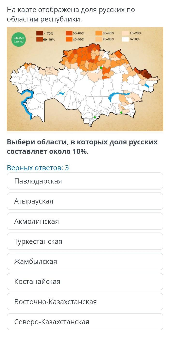 Национальный и религиозный состав населения Казахстана На карте отображена доля русских по областям республики.  Выбери области, в которых доля русских составляет около 10%.