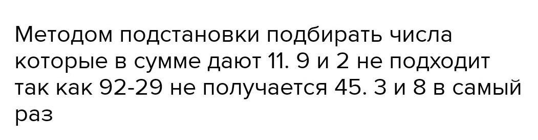 сумма цифр двузначного числа равна 11 если эти цифры поменять местами, то получится число, которое на 45 больше первоночального. Найди первоначальное число.