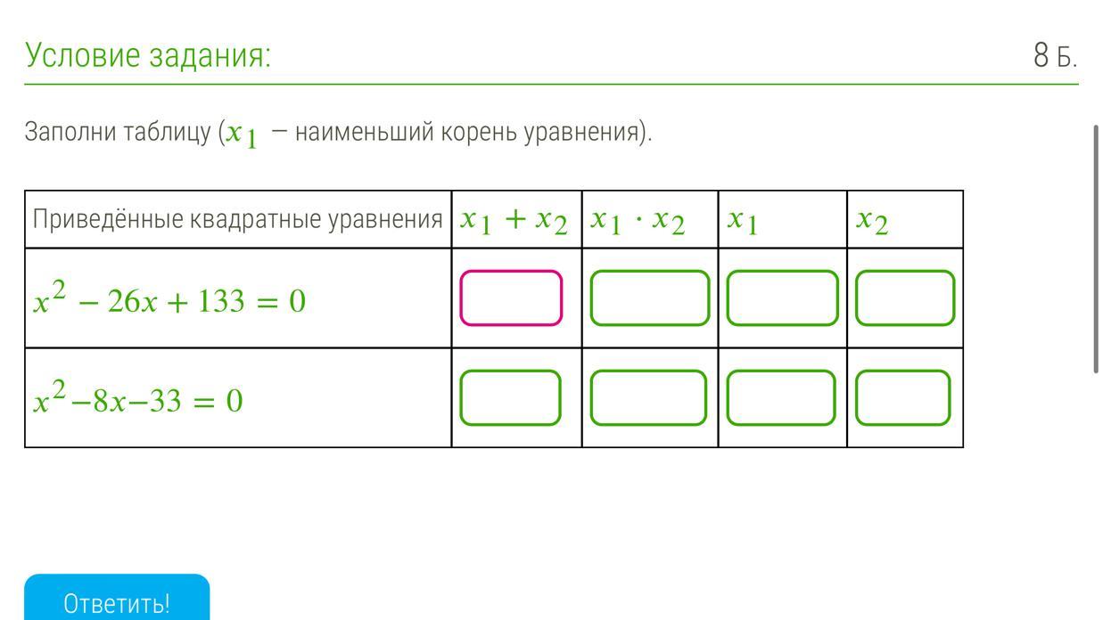 x1+x2 =26; x1*x2=133;x1=7;x2=19