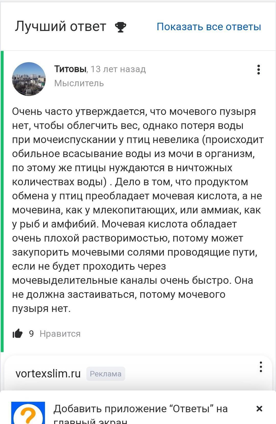 Продуктом обмена у птиц преобладает мочевая кислота, а не мочевина, как у млекопитающих, или аммиак, как у рыб и амфибий. Мочевая кислота обладает очень плохой растворимостью, потому может закупорить мочевыми солями проводящие пути, если не будет проходить через мочевыделительные каналы очень быстро. Она не должна застаиваться, потому мочевого пузыря нет.