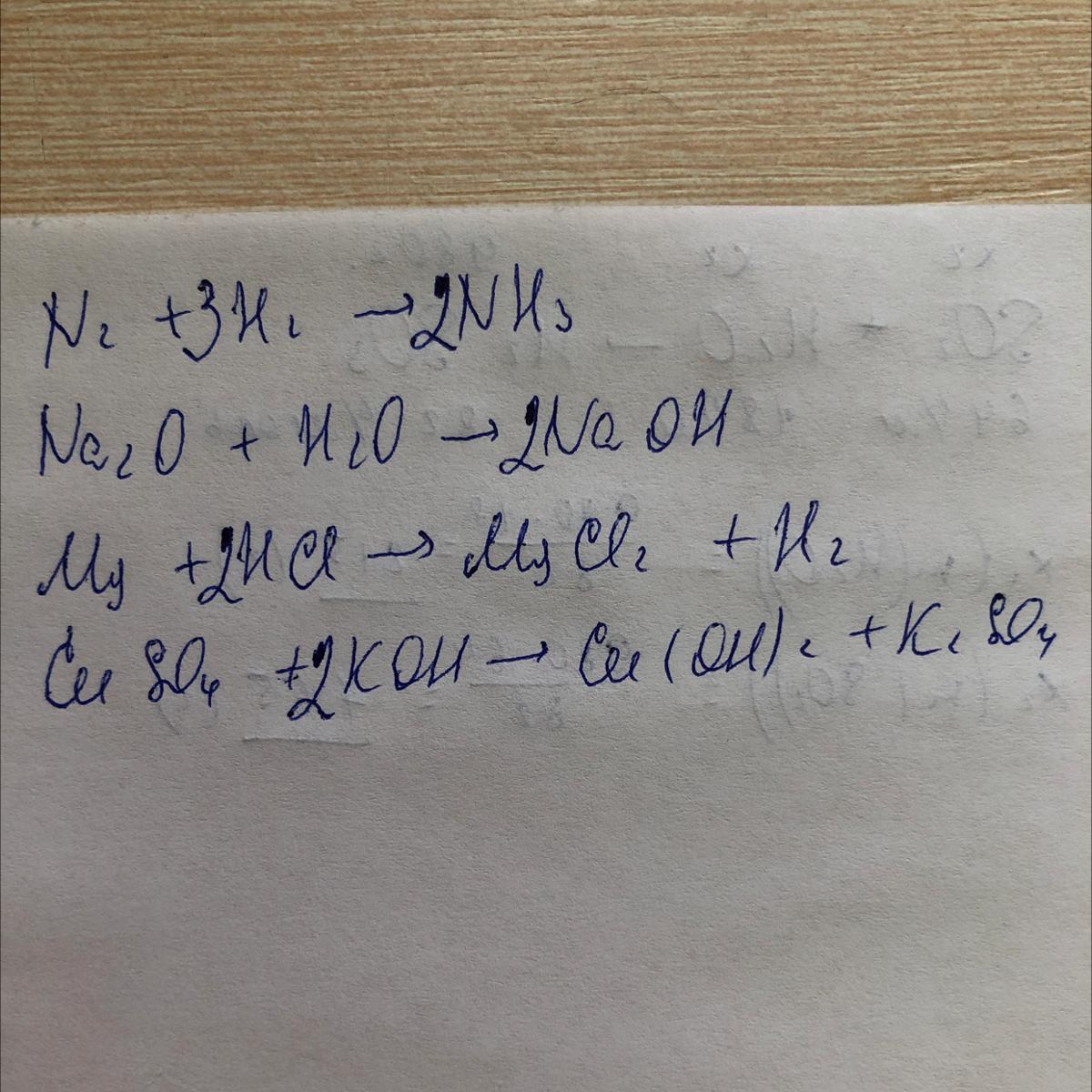 N2+H2 =NH3; Na2O+H2O=NaOH; Mg+HCl=MgCl2+H2; CuSO4+KOH= CU(OH)2+ K2SO4