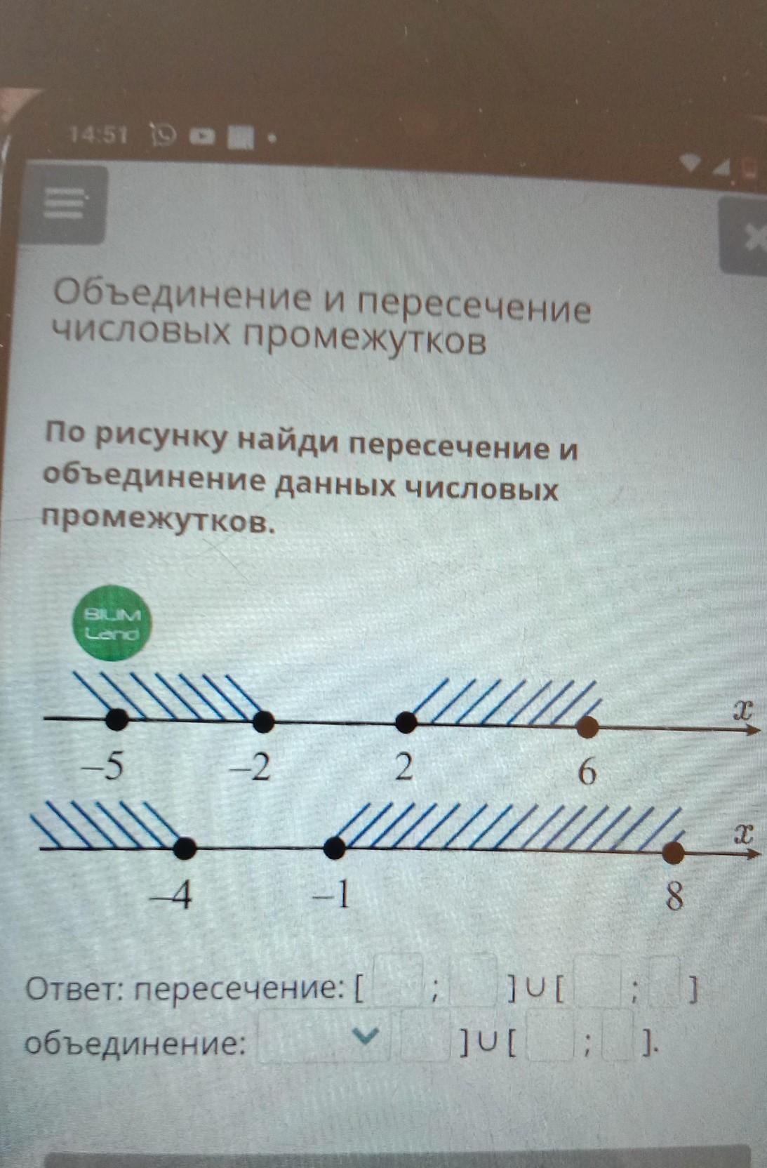 По рисунку найди пересечение и объединение данных числовых промежутков. BLIN Lend -5 -2 2 6 ка 4 --1 8 Ответ: пересечение: [ объединение: jut : ) [ ju[:].