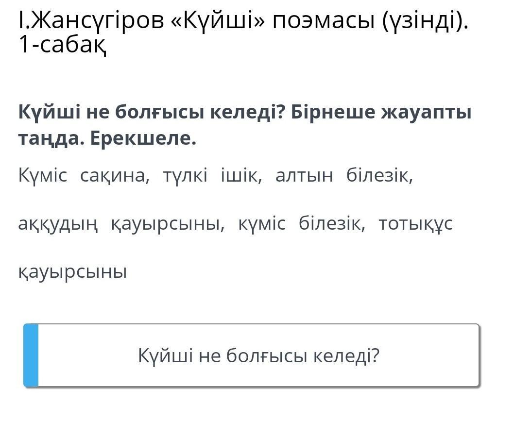 Куйшi не болғысы келедi? Бiрнеше жауапты таңда. Ерекшеле. Күміс сақина, тулкі ішік, алтын білезік, аққудың қауырсыны, күміс білезік, тотықұс қауырсыны Куйші не болғысы келеді?