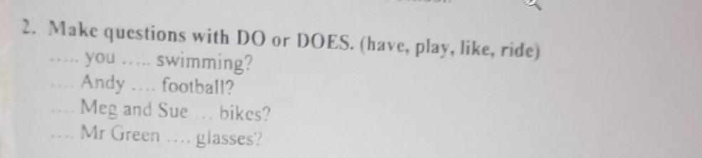 2. Make questions with DO or DOES. (have play, like, ride) you - 2. swimming Andy, football? Med and Sue STA Mr Green glasses
