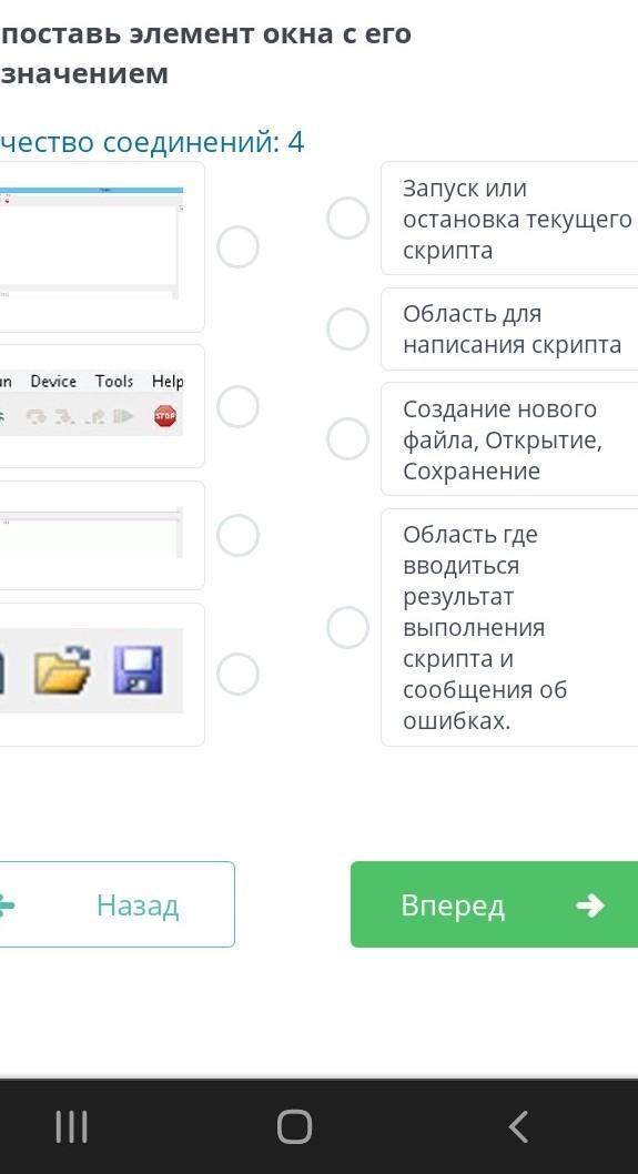 ЗАДАНИЕ №1 ВРЕМЯ НА ВЫПОЛНЕНИЕ: 19:39 ТЕКСТ ЗАДАНИЯ Сопоставь элемент окна с его назначением Количество соединений: 4 Запуск или остановка текущего скрипта Область для написания скрипта Создание нового файла, Открытие, Сохранение Область где вводиться результат выполнения скрипта и сообщения об ошибках. Назад Вперед