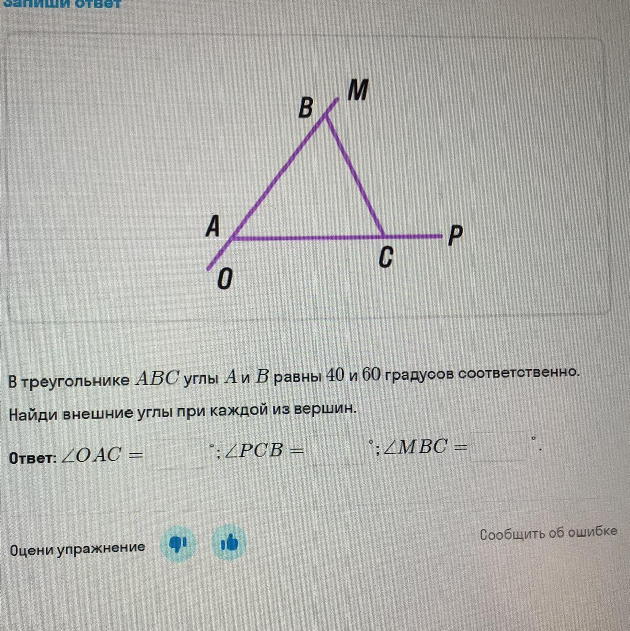 Внешние углы с соответствующими углами треугольника в сумме равняются 180°