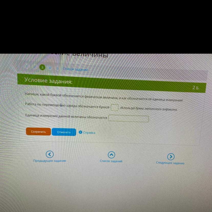 Работа по перемещению заряда обозначается буквой . Используй буквы латинского алфавита. Ответ: