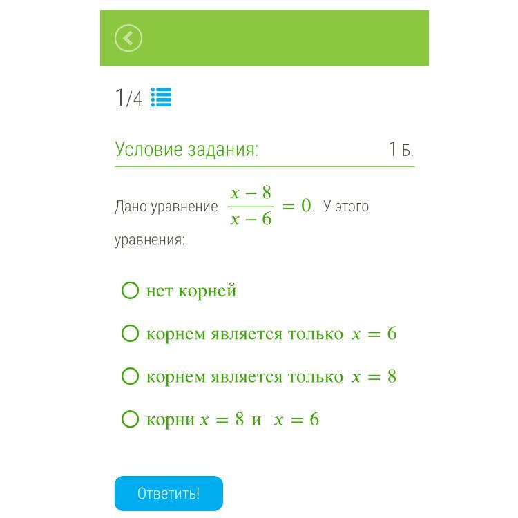 Корнем является только число 8! Если мы подставим 6, то знаменатель обратиться в ноль, а на него делить нельзя