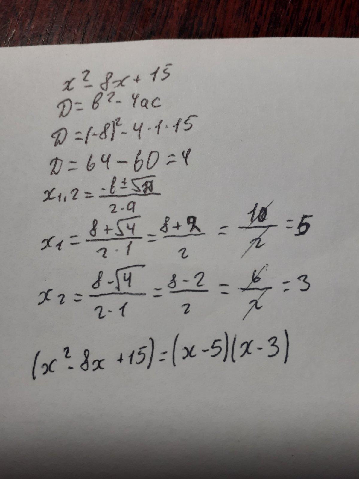 розкласти квадратний тричлен на множники: x²- 8x + 15 =