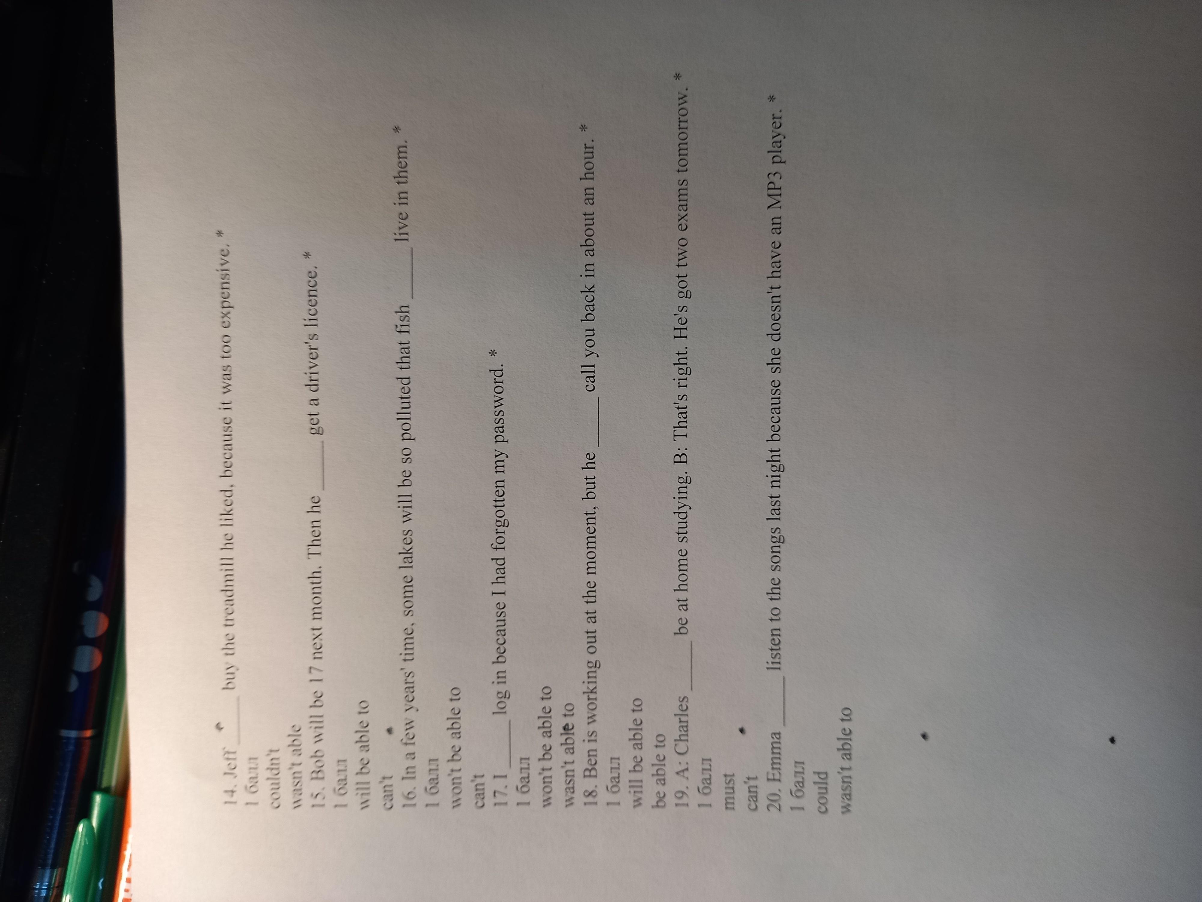 Ответ:1. Wasn't able; 2. Will be able to; 3. Won't be able to; 4. Wasn't able to; 5. Will be able to; 6. Must; 7. Wasn't able to;