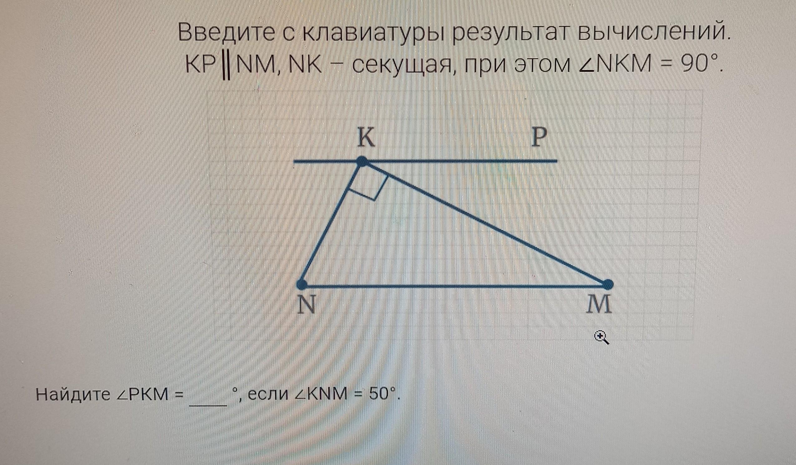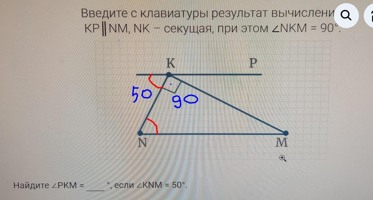 по теореме о двух параллельных прямых и секущей: если КР параллельна NM, то накрест лежащие углы равны (на рисунке отмечены красным). По условию эти углы равны 50 градусов (угол КNM=50).