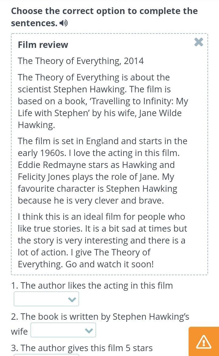 Reading Different Film Reviews Choose the correct option to complete the sentences. 1. The author likes the acting in this film 2. The book is written by Stephen Hawking’s wife 3. The author gives this film 5 stars