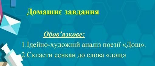 Тема твору: зображення значення благодатного дощу для природи, як винагорода людям за працю. Ідея твору: оспівування краси та гармонії в природі. Основна думка: любування красою та гармонією у природі; барви, свіжість та врожай несе благодатний дощ. ... Тематика: пейзажна лірика.