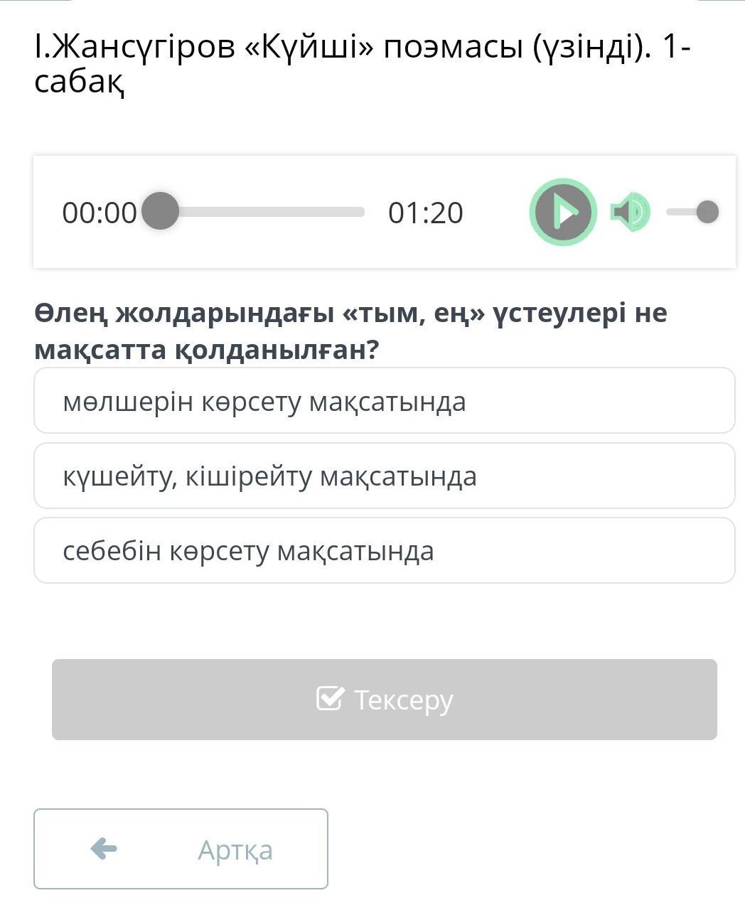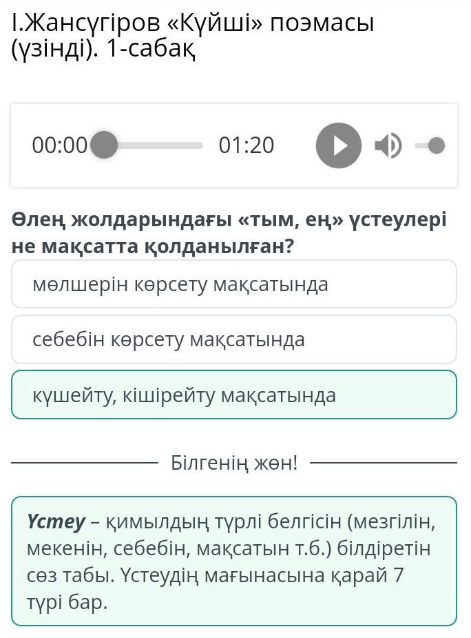 І.Жансүгіров «Күйші» поэмасы (үзінді). 1-сабақ 00:00 01:20 Өлең жолдарындағы «тым, ең» үстеулері не мақсатта қолданылған? мөлшерін көрсету мақсатында күшейту, кішірейту мақсатында себебін көрсету мақсатында