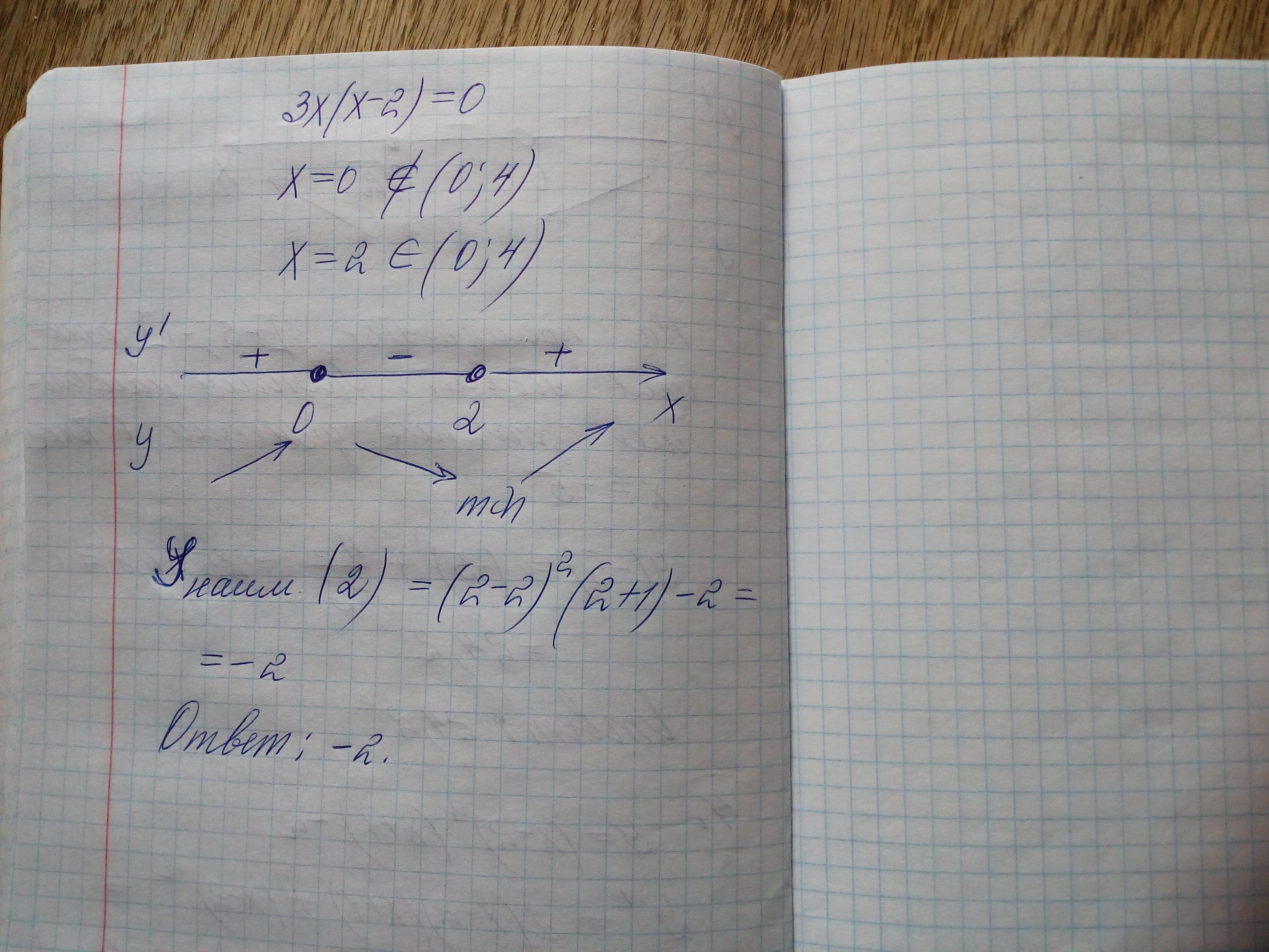 4. Найдите наименьшее значение функции у = (х - 2)^2 * (х + 1) - 2 на отрезке (0; 4)